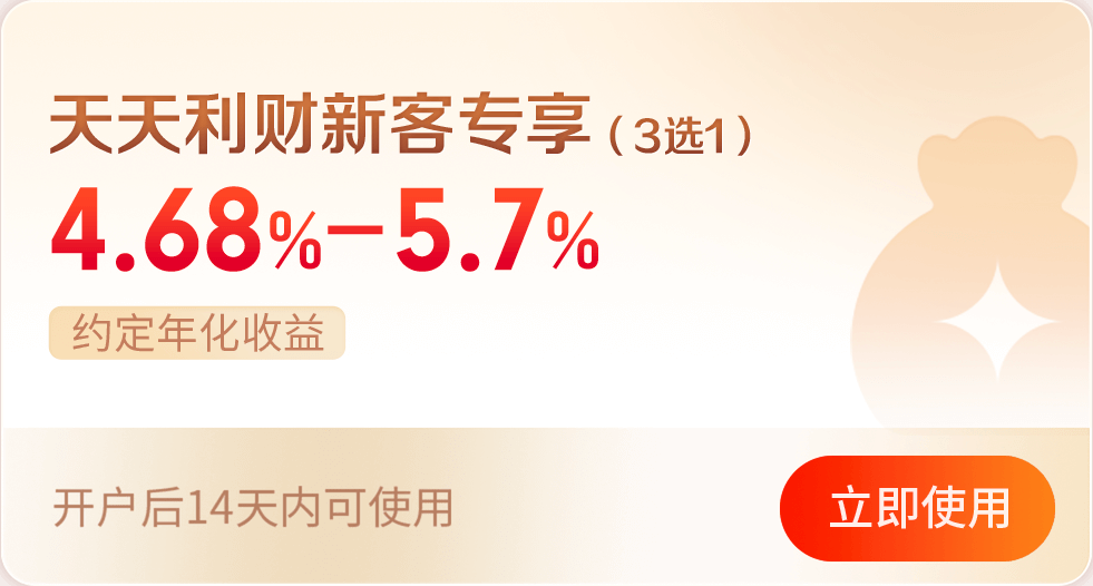 (4)新客专享天天利财x月月盈联名款要素: 约定年化收益率5.7%,期限28天,参与起点1万,参与上限7万元,T+1交易日起息。“天天利财X月月盈”联名为中信证券新上线质押式报价回购业务与基金投顾业务结合的理财方式。本联名款权益中,天天利财部分约定年化收益率5.7%,盈理财-月月盈无年化收益率。“盈理财-月月盈”为中信证券基金投顾业务提供的基于货币基金、同业存单基金的基金投资组合策略。“天天利财X月月盈”联名款权益在“天天利财”合约到期后,将认购金额(不含到期利息)入金基金投顾“盈理财-月月盈”策略组合,实际入金金额以入金成功短信通知为准。尚未入金“盈理财-月月盈”组合策略前,客户可提前赎回,提前赎回约定年化收益率为当期活期利率,参与新客专享的资金若需取款,需提前一交易日手动操作预约取款,且提前赎回部分无法自动入金月月盈-盈理财。持有“天天利财”期间产生的利息将于到期日进入客户可用资金,若未开启余额自动委托,将于“天天利财”到期日恢复可用,到期日次一交易日可取。“天天利财”到期资金自动入金基金投顾“盈理财-月月盈”组合期间,可能出现由于前期赎回后存量本金规模不足1万元、客户自主挪用或小概率系统异常导致的入金失败风险,请知悉自主挪用资金可能带来的入金失败风险。基金投顾“盈理财-月月盈”组合因持有同业存单基金类最短持有期产品等因素,在您转入或追加资金的成分基金申购确认成功之日起的7个自然日内 (不含当日) ,不接受组合资产赎回申请或组合转换申请,第7个自然日起 (含第7个自然日,如果第7个自然日为非交易日则需顺延至下一交易日) ,组合资产可正常转出 (除调仓等导致的在途因素外),转出时间T+1至T+5日不等。基金投顾“盈理财-月月盈”组合策略需收取年化0.1%的投顾服务费。参与“天天利财×月月盈”联名款需签署相关业务协议,签署业务协议即视为同意上述安排;